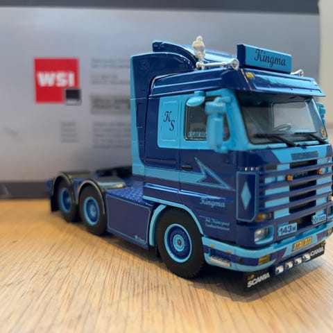 Mohlins, Scania 143M 500 bil og henger. Flott Mohlins sett, eskene er ikke bra. Produsert av Tekno. Skala 1:50. Forskuddsbetaling ved sending (kombinerer gjerne porto), sender som pakkepost.