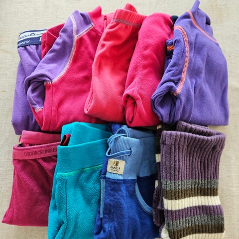 Massevis av ullklær i størrelse 110/116 og en mørk grå bukse i 122 (liten i størrelsen, tilsvarer mer en 116).