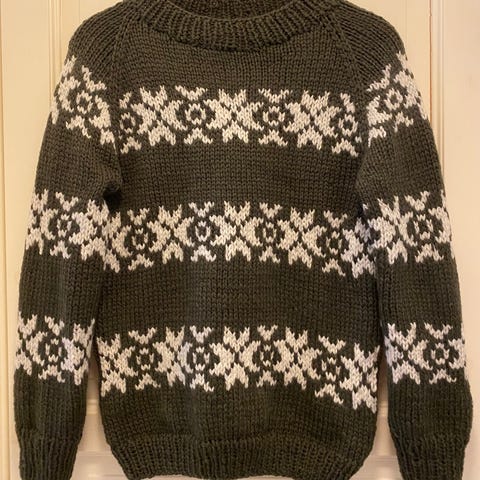 Selger denne gode genseren da den dessverre ble for stor for meg. Strikket i str M, men er nok en M/L i omkrets i bolen. Lengden er normal. Ermene er normal lengde og over skuldrene er størrelsen normal.