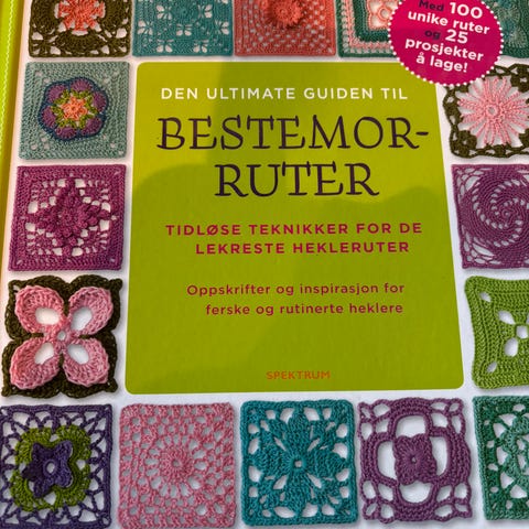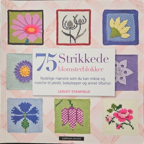 Fin bok på 128 sider. Heftet utgave fra 2014. 75 strikkede blomsterblokker.