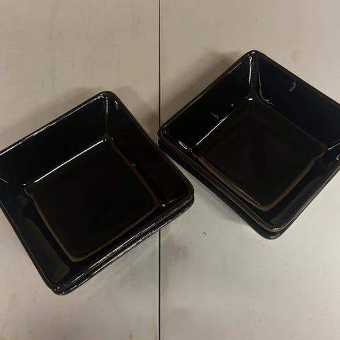 13,3 x 13,3 x 4 cm. Brun-svart. Ser svart ut until det står ved siden av noe helsvart. Et par meget svake bruksmerker, ellers feilfri. Jeg har tre avdissevi forskjellige størrelserHvis du kjøper de to største som er større får du det minste fatet gratis.
