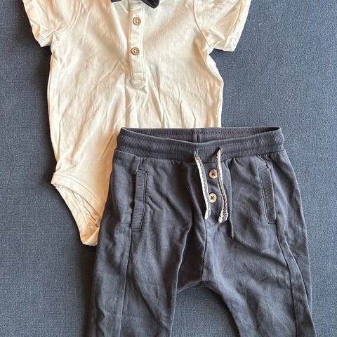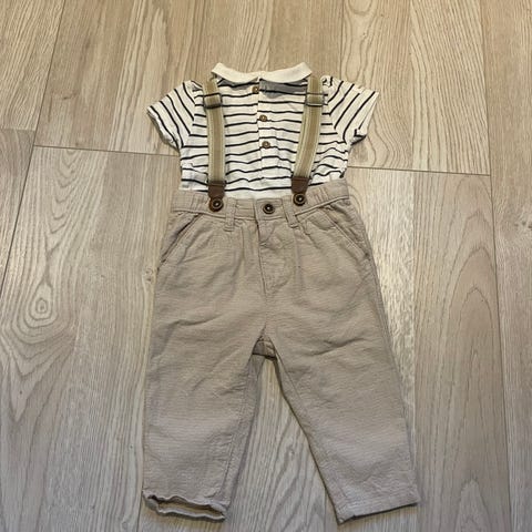 Fin støvet grønnfarge på buksa og stripene i bodyen, fargen kommer ikke så godt frem på bildet. Buksa har praktisk åpning mellom benene for bleieskift.