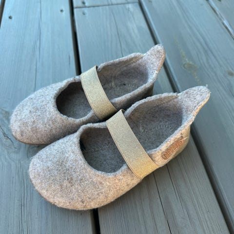Skinntøfler med indre mål på 17cm, tilsvarer ca 26-28 i vanlig skostørrelse. Tøflene er varme og behagelige. Det er borrelås på siden.