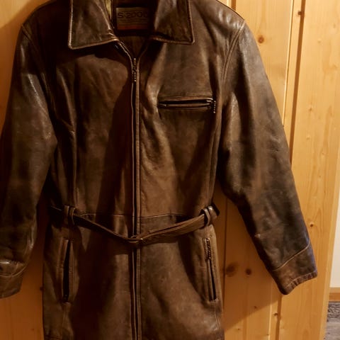 Lite brukt semsket skinnjakke i mørk grå i strl L, men vil heller si det er en M.