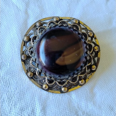 Fine retro brosje fra finsk Torun Hopea, ikke sikker hvem har laget brosjen. Fra 60/70 tals. 813s med nydelig tigere øye stein- ingen bruksspor. 4.8cm. Se bilder.