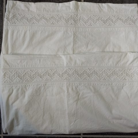 De har et engelsk broderi oppe ifront ( hvitt på hvitt med " hull" effekt ). De er laget i bomull. Feilfrie, men er litt gulnet pga av alder og burde kanskje klores litt. Yttermål ca 58 x 47 cm