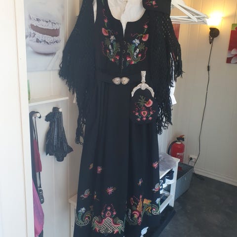 Pent brukt bunad fra ca 1985. I utgangspunktet ca str 36. Men lagt ut til 42 ca Pent brodert og ingen hull. Bluse i 100%lin. Pen uten flekker. Noen løse tråder forran. Se bilder Ellers ikke slitt. Spør gjerne om mål eller flere bilder. Har igså bunadsko str 38 hvis intressert.