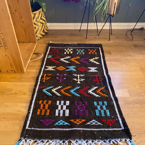 Type: Interiørpuff / fotskammel / sittepute, Materiale: 100 % naturlig ull fra vintage El Yacoubi-teppe, Farge: Flerfarget med tradisjonelle berbermønstre, Mål: Ca. 60 × 60 × 20 cm, Passform: Myk og formbar etter fyll, Design: Håndlaget med autentisk marokkansk uttrykk, Stil: Bohemsk / skandi-boho / etnisk / trend, Bruk: Stue / soverom / lounge / oppbevaring, Tilstand: Nyprodusert av vintage tekstil, selges uten fyll