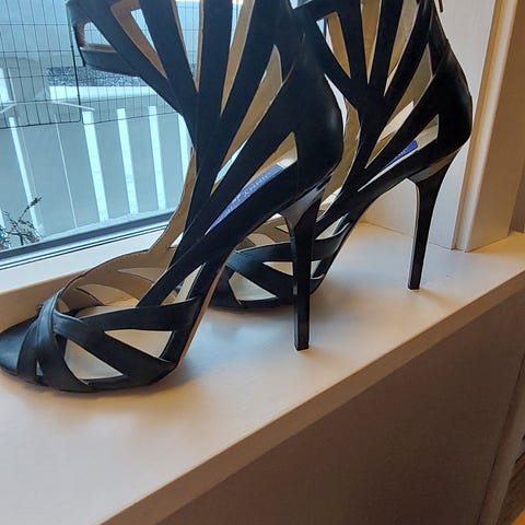 Gladiator sandaler høy hæl hel sort svart Stiletto Hæl Pumps design sko italienske Haute couture strikk Leather Peep-Toe Elasticized Cage Booties leather peep-toe pumps with straps at tops, stitching and covered heels. Heels: 4" black