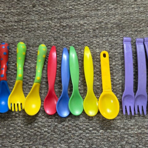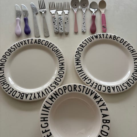 Pent brukt bestikk i Letters design. Selges samlet 7 deler kr 250.