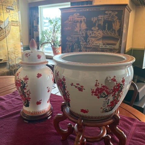 Keramisk blomsterpotte med asiatisk motiv
