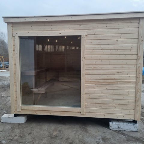 Kompis Badstue med avslapningsrom er en perfekt badstue for en romslig gård eller en liten hage som er klar til bruk første dagen etter levering. Badstuen har 2 benker (200x58 cm) innvendig, som lar 2 personer ligge eller 4-6 personer sitte i badstuen.
