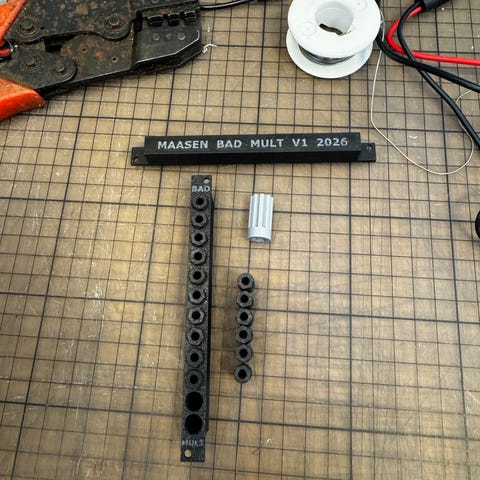 Praktisk gaffel for å få orden på eurorack-kabler. 147x84mm stor med to monteringshull for skruer. 3D-printa i PLA plastikk.