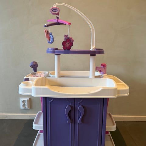 Selger vugge til dukke og skiftebag med bleier, flaske og leke.