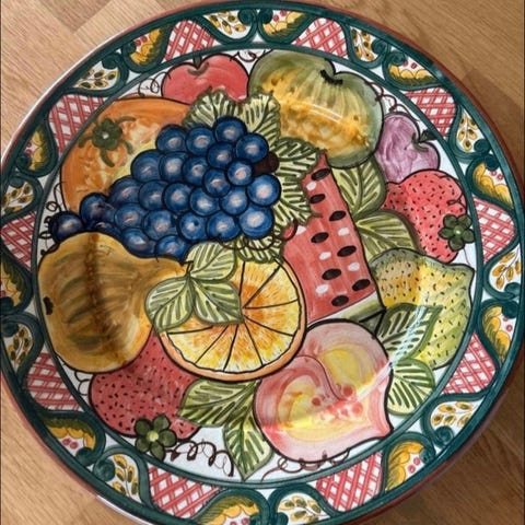 Stort nydelig vintage keramikkfat med veggoppheng på bakside. Størrelse 50 cm (hank til hank) x 44.