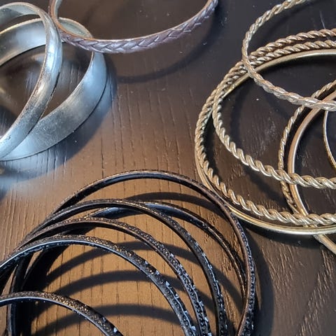 Strassarmbånd, perler, svart lilla og sølv. Med stretch.