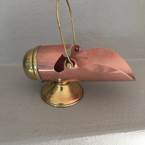 Eldre flott kobber krukke m/ lokk. 3 føtter. (15 x 10 cm.) God stand. Retro....