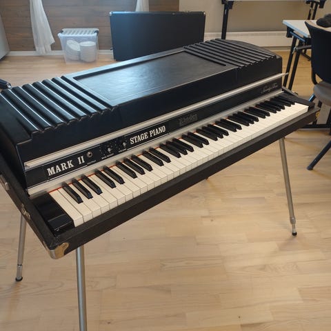 Dette "hovedinstrumentet" krever en ambisiøs eier:) Til en pris av en middels bra saxofon eller en ganske brukbar bratsjbue får du dette topp of the line el. piano. Et tidlig Rhodes 73 Suitcase Mark1/2 i topp stand. Dette er fra 1980 og var helt i overgangen fra mark1 til mark 2. Dette har tretangenter. Det var ikke store forskjellene i overgangen mellom 1 og 2. Ofte bare lokket. Det har vært på Vintagebua og fremstår strøkent. Klangmessig mer Mark 1. Har installert Cheek block og har i tillegg ekstern pedal. Da kan man velge å bruke piano som et vanlig standard stage piano uten å benytte kabinettet, men samtidig få med den fine stereo preampen. Det særegne kabinettet har jo en spesiell anerkjent sound når man bruker mikrofoner i feks studiosammenheng. Vil nok trives i et studio eller kanskje på veien som en stage utgave uten kabinet. 2 stk. video som viser Rhodes med custom 2 in1 Samme sustain pedal til Rhodes og Moog One i dette tilfellet. Lettspilt og homogent i klangen. Er brukt på flere skiver. Bl.a denne; https://open.spotify.com/artist/5Fj5aoJAHQPttiJmxuSx9C?si=OPhBUxGnQWaixlODS3fNmw