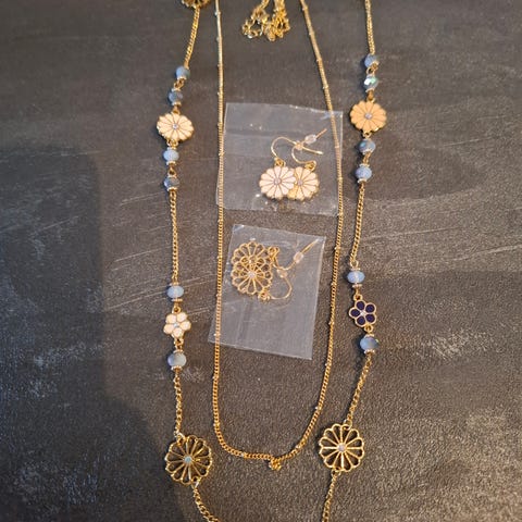 Elegant halssmykke I roségull farge plyndret med lys grå og sjampanje farge krystaller. Lengde 70cm. Kan sende.