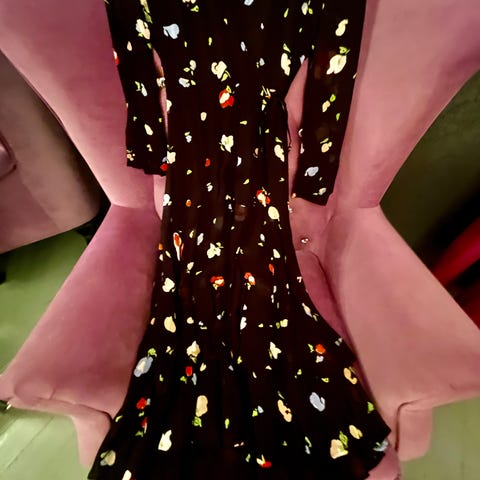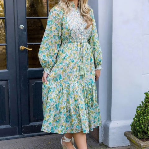 Ny maxikjole i 100% viskose. Nypris kr 1.299,-. God og romslig og passer opp til str 42. Pyntebånd langs v-hals. Snøring under bryst. Splitt nede. Underkjoler i bomull. Selger kun fordi jeg har en til helt lik men i annen størrelse 👍 Deilig, luftig, god kjole.