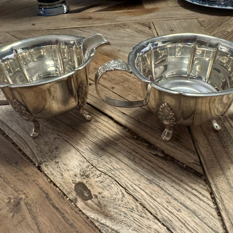 Gammelt fløtesett i sølvplett. Nydelig fat selges med, hvis ønskelig.kr.100 Kan hentes på Heimdal. Ved sending kommer porto i tillegg.