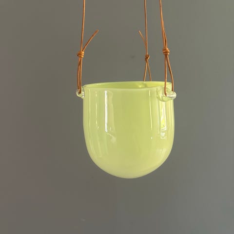 Lys grønn blomsterpotte med hyssing. Er ca. 9,5 cm høy og diameteren er ca. 12,5 cm.