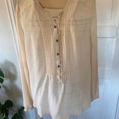 Kjempefin bluse i blanding av silke og bomull fra Custommade. Nydelig og mykt materiale. Den er i str. 40, men liten i størrelsen og passer nok bedre 38. Flotte blonder/rysjer foran. Pent brukt, ingen bruksmerker.