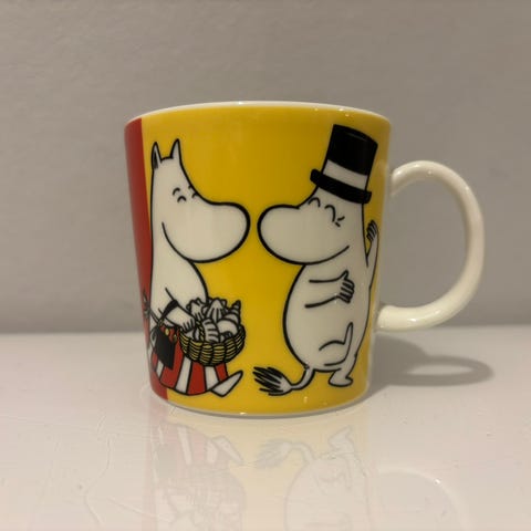 Det er en varm sommerdag og Mummifamilien sover i hagen. Mummitrollet og Snorkfrøken kryper sammen under et pledd og Mummipappa døser av i hengekøyen. Mummimamma elsker å sove utendørs og er glad hun har fått med seg hele familien. Solen går ned og ingen bekymrer seg for morgendagen. Moomin by Arabia, Krus 0,3L, Hvilestund