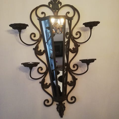 Veldig dekorativ telysholder med speil til å henge på veggen. 20*20.