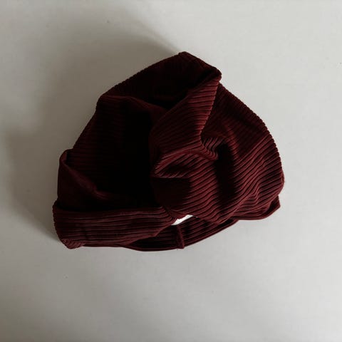 Rød, gul og hvit lue med lang topp og opprettet kant. 100% bomull