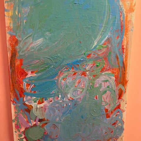 Abstrakt kunst, bilde malt med vannfarger. Greier ikke å tyde signaturen.