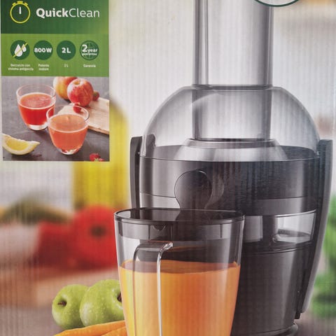 Philips sin juicer i børstet aluminium kommer med to hastigheter, et unikt "micro-mesh" filter og en beholder med kapasitet for 2 liter nypresset juice.