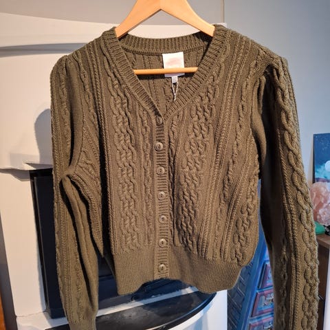 Hjemmestrikket vest i tynt ullgarn. Fint brukt, framstår som ubrukt. Str. ca 38.