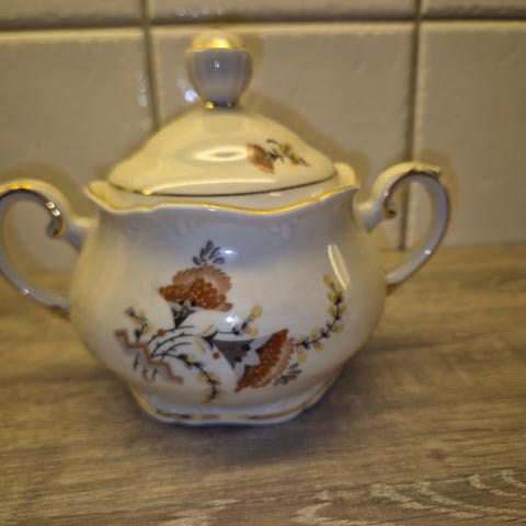 Vakker skål fra Porsgrunn med lokk. Merket «Vega». Høyde til lokk: 10 cm. Diameter 12 cm