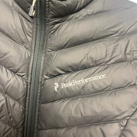 Pent brukt Peak Performance dunjakke. Str S, god i størrelsen. Jeg er til vanlig en M. Ingen skader eller slitasje, fremstår som ny. Farge: Mørkeblå.