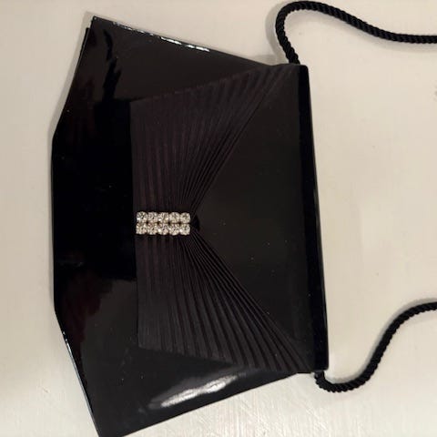 Nydelig clutch veske i silke lignende stoff.Mål:L 28 cm. B 5,5 cm. H 9 cm.Lengde på kjede 55 cm.