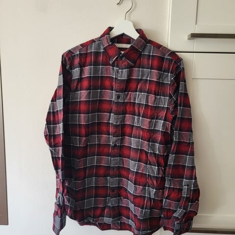 Pent brukt rød, sort og grå/hvit rutete flanellskjorte. Noe tynnere i stoffet enn de andre flanellskjortene jeg har lagt ut.