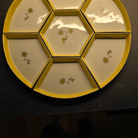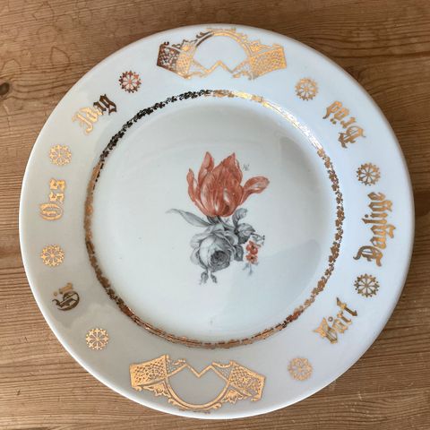 Stort bestemorfat Porsgrund Porselen, merket 1950 på undersiden. Blomsterbuketter med ulike blomster rundt kanten. Noe høyere kan enn normalt.
