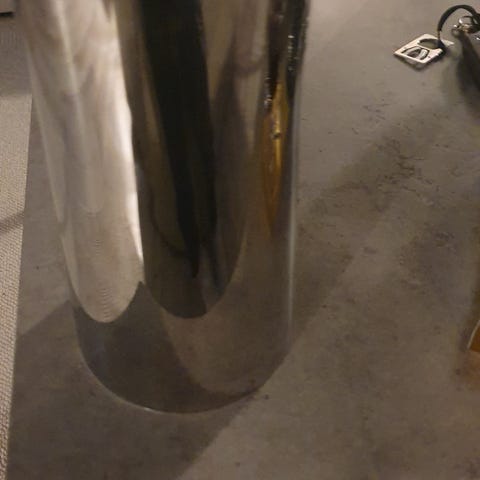 Selger Georg Jensen utelykt i rustfritt stål. Lykten passer til fakler eller til kubbelys. Lykten har alltid stått inne. Modell: Ribbon. Utgått modell.