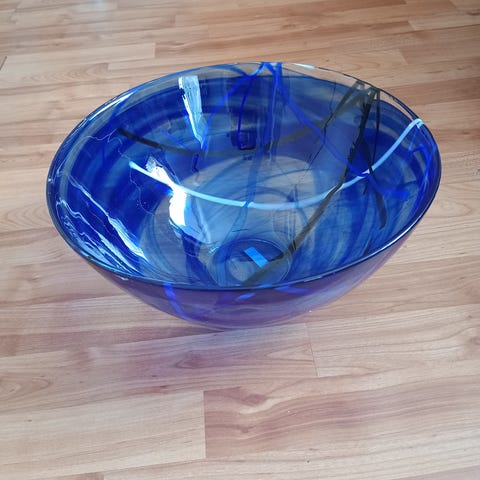 Stort gjennomsiktig fruktfat i blått. Diameter 40 cm, høyde 10 cm. God stand, ingen skader.