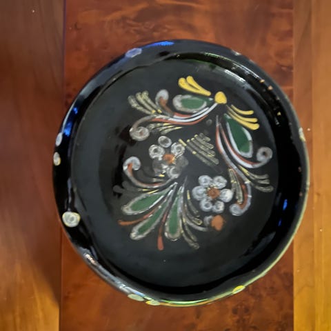 Askebeger i keramikk, merket NORGE og med et merke som mest sannsynlig sier at det er produsert ved keramikkfabrikken Gann Graveren utenfor Sandnes.