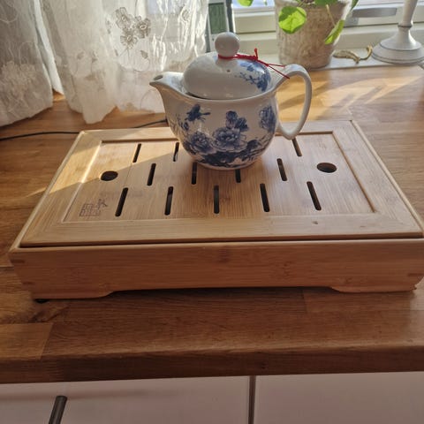 Håndmalt teservice fra Narai Phand. Settet består av en tekanne, et fat og fem små kopper. Ingen skader. Teservicet ligger trygt i en koffert. Selve håndtaket på kofferten har dessverre løsnet.