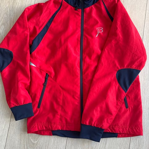 Skijakken er blå og er godt brukt, men i grei stand og klar for ny eier