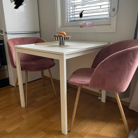 Selger bord ( 130x70x102) og to stoler(75cm) sammen.
