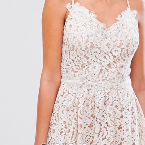 Vakker, kort hvit blondekjole i størrelse S fra Ministry of Style. Den har korte ballongermer, og et åpent parti på baksiden (mellom overdelen og skjørtet, se bilde). Utrolig kul detalj på en ellers klassisk kjole! Den lukkes med en glidelås i gull på baksiden og knytes med et bånd bak. Nydelige blondedetaljer.