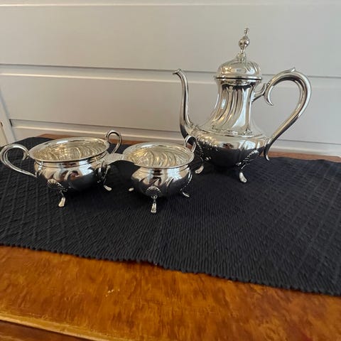 Kaffekanne, fløtekanne og sukkerskål i sølvplett