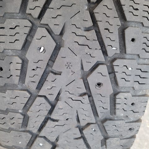 Dekkene er lite slitt, dypt og fint mønster og har de fleste piggene intakt.