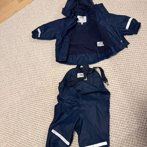 2 sett til gutt str 74 Et sett mørk blå jakke bukse og lue. Ett sett Beige /brun jakke bukse lue votter og sko/ tøffel. Totalt 8 deler. Selges samlet kr 150