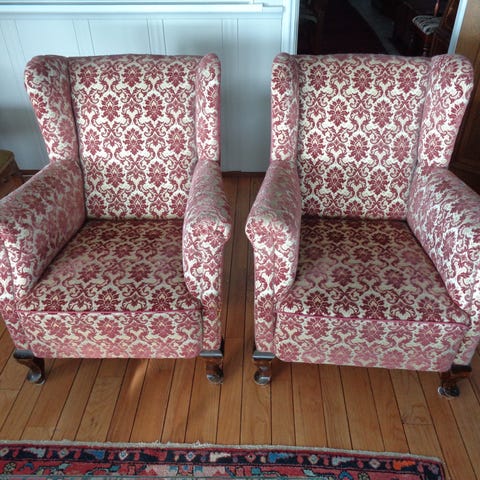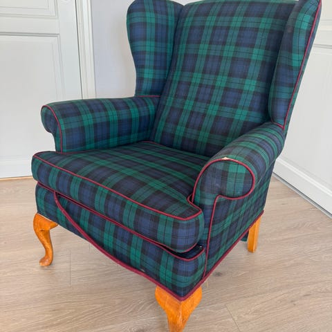 Eldre ørelappstol med flott nyere stoff og god stopping.