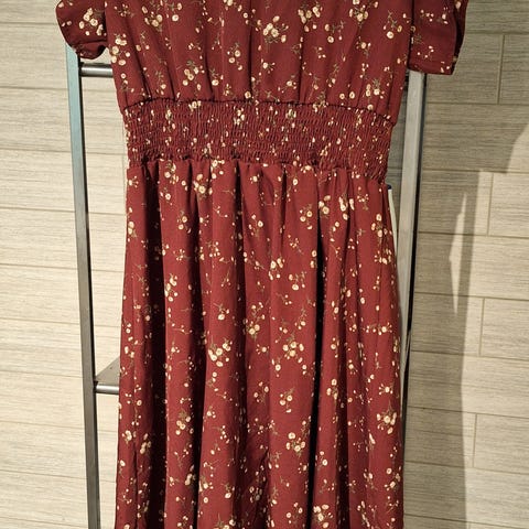 Lekker rød kjole med fint gjennomsiktig mønster øverst. Drapering som gjør at den skjuler magen, innsvinget. Flott solid stoff som gjør at kjolen faller pent på den den passer. Står L, men tror det er mer M størrelse. 38-40. Aldri brukt, da den var for liten da jeg skulle ta den i bruk. Kjøpt for 899.-
